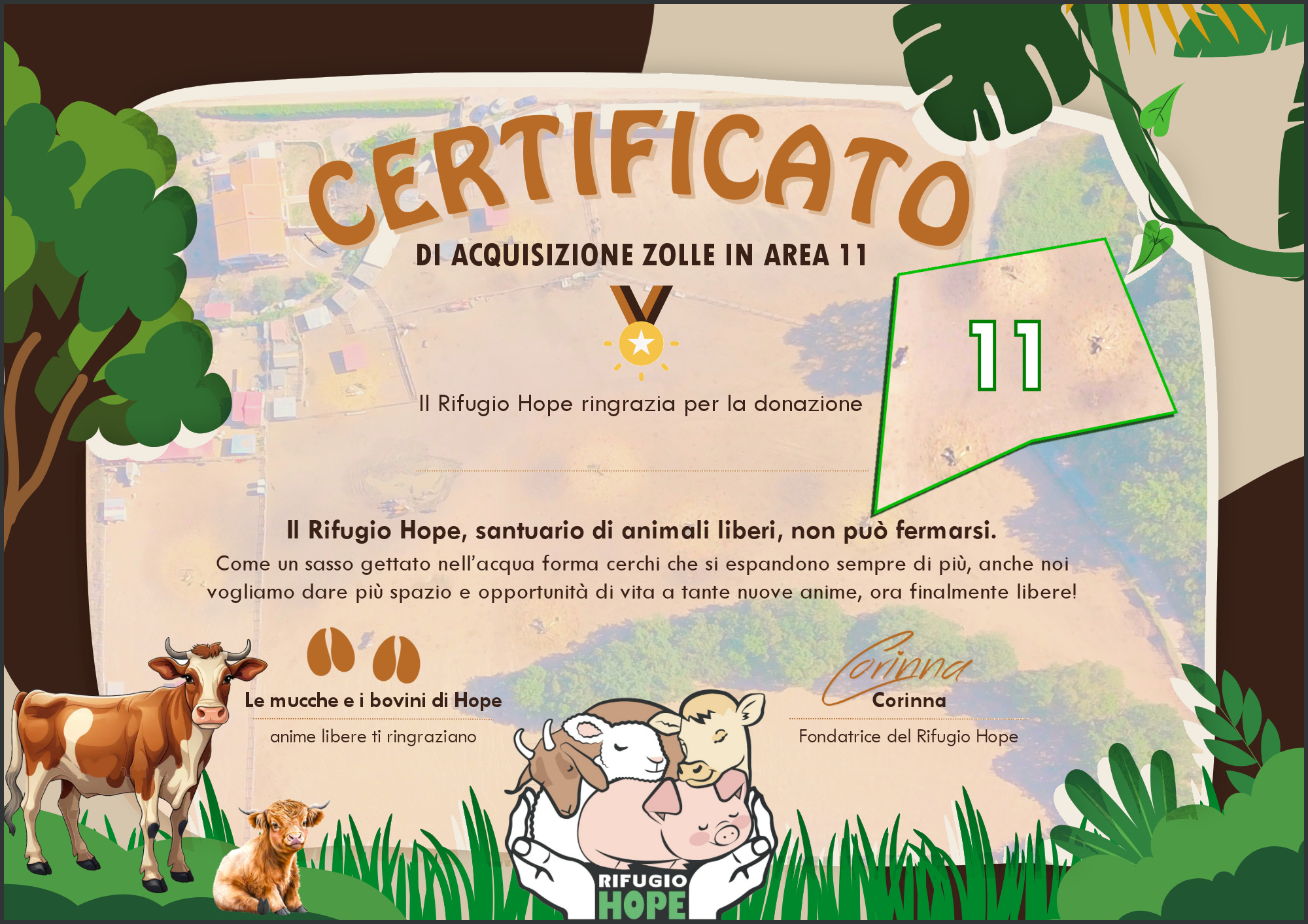 Abbiamo suddiviso il terreno che vogliamo riscattare in 12 aree, ognuna suddivisa in 1400 zolleย del valore di di 20โฌ. Puoi acquistare virtualmente una o piรน zolle e scaricare lโattestato di donazione personalizzabile con il tuo nome o il nome di chi vuoi.